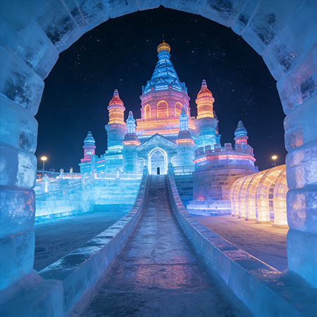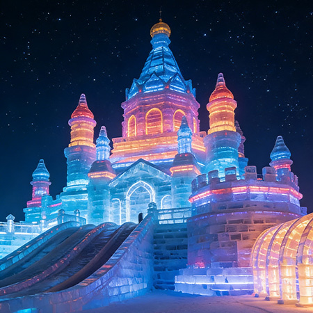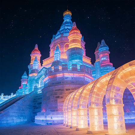 大型冰雕展以冰为原料,通过雕刻、塑形等工艺打造出人物、建筑、卡通形象等多种主题冰雕作品,展区内辅以彩色灯光映衬,冰雕在光影下呈现出晶莹剔透的质感…